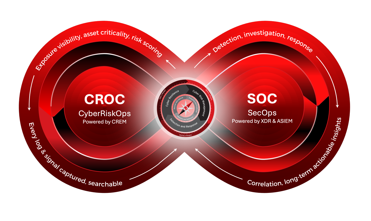 At its center, the Loop connects CROC, or CyberRiskOps powered by CREM, and SOC, or SecOps powered by XDR and ASIEM, into a single coordinated organism. The SOC represents the analytical neocortex, the realm of detection, investigation, correlation, and long term understanding. This is where threats are interpreted and intelligence is refined. The CROC represents the limbic system, the business oriented risk engine that assigns meaning and criticality to every signal, mapping exposure, asset value, and operational impact. It provides the answer to the essential question in cybersecurity, which is not whether an event is malicious, but how much it matters. Complementing both layers is the instinctive core of defense, the reflexive and autonomic response mechanisms that act during the milliseconds when cognition is too slow and when survival depends on immediate action.
