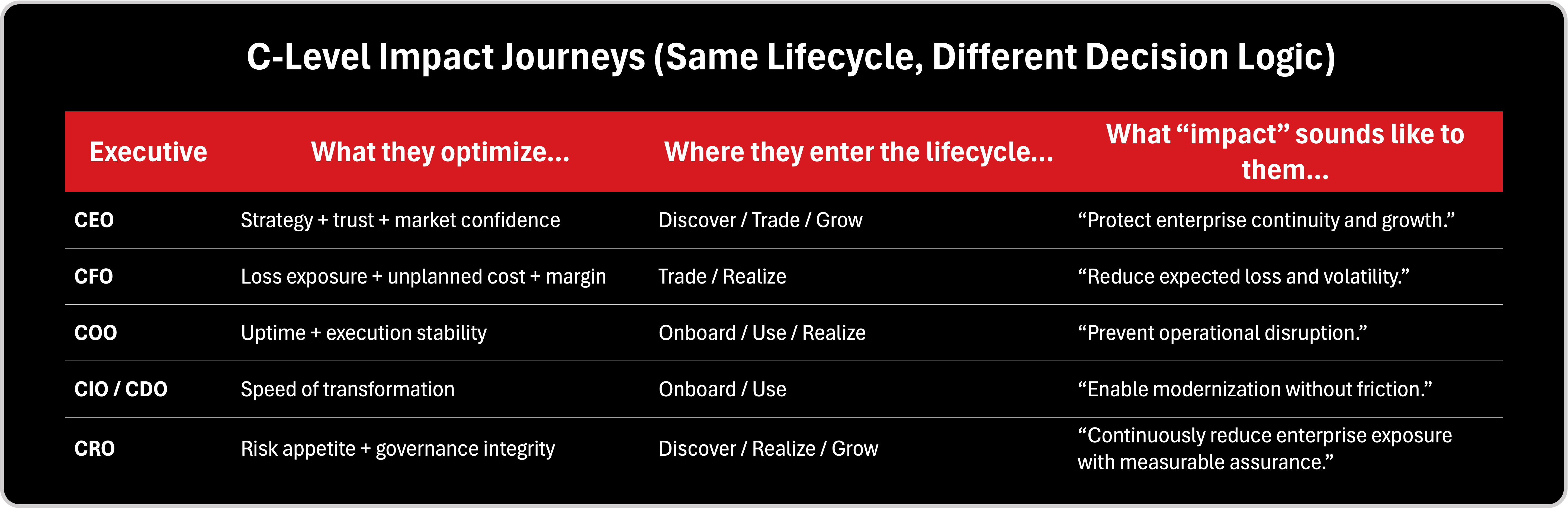 But there is another layer in that diagram that is often overlooked, and it matters enormously for board communication. This lifecycle also reveals that each C-level executive experiences a different impact journey, even if they are looking at the same security program. The phases are the same, but the entry point, the concerns, and the proof required are different. A CEO’s impact journey usually starts in Discover and Trade on Impact, because CEOs care about enterprise outcomes: strategic risk, market confidence, reputational exposure, and growth enablement. They need clarity on what could break the company and what could stall the strategy, so impact needs to be framed emotionally first—trust, continuity, brand, confidence, then validated rationally, because human beings tend to decide emotionally and validate later with facts. A CFO’s journey is different: it is anchored in Reduce COST, loss exposure, unplanned spend, margin pressure, insurance economics, and risk-to-cashflow. CFOs don’t want a list of controls; they want a view of expected loss, cost of downtime, and investment tradeoffs. A COO’s journey is operational: the COO lives in Onboard → Use → Realize Impact, because operational leaders don’t debate whether security matters, they need to know whether security prevents disruption and makes execution more stable. Their language is resilience, uptime, productivity, and predictable operations. Meanwhile, a CIO or Chief Digital Officer experiences impact through transformation speed: cloud adoption, modernization, and delivery of digital services without friction. Their focus sits between Tech Onboarding and Realize Impact, because the question is not only “is it secure?” but “does security accelerate or slow our ability to ship?”