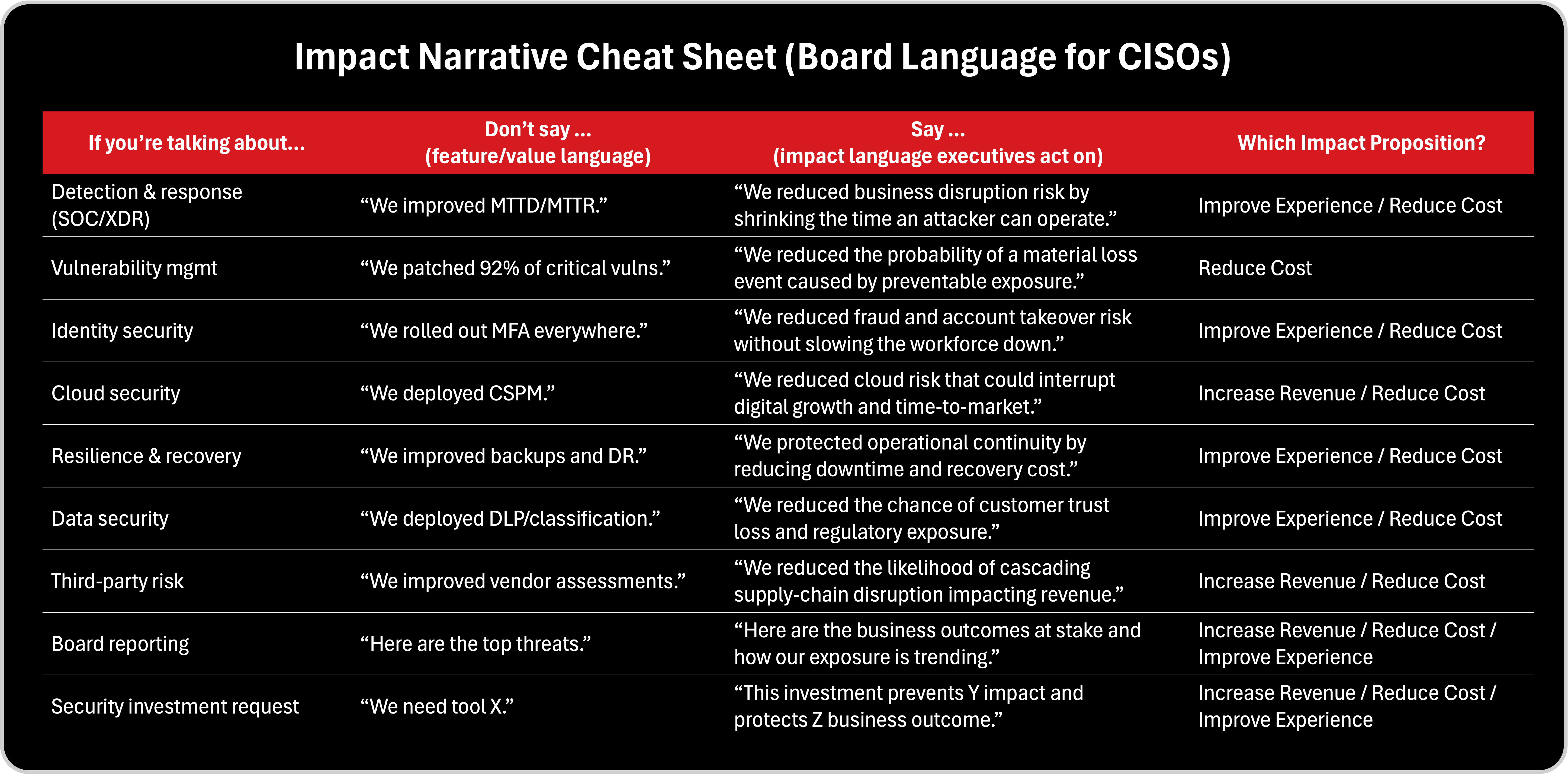 One of the most practical tools in Jacco’s blueprint is the definition of three high level impact propositions: reduce cost, improve experience, and increase revenue. This is the perfect executive translation layer for a CISO. Because every security initiative, if it matters, must map into at least one of these outcomes.