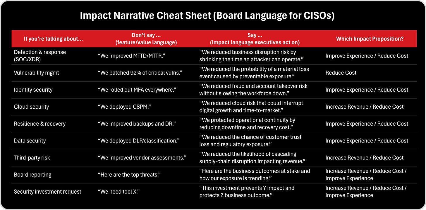 The modern CISO cannot win long term by reporting activity. Activity is always debatable. It’s easy to ignore, easy to downplay, and too often it sounds like cost. Impact is different. Impact is what boards are accountable for. Impact is what executives will fund. Impact is what business leaders can prioritize because it connects directly to outcomes: continuity, trust, resilience, and growth. That’s why the Impact Framework is so relevant for cybersecurity leadership: it makes clear that the old story is broken. CISOs must stop selling features, stop leading with needs, and stop assuming metrics will speak for themselves. Instead, we must diagnose the situation, peel the onion, uncover what is truly at stake, and translate cybersecurity into the language of business impact, reducing cost, improving experience, and enabling revenue.
