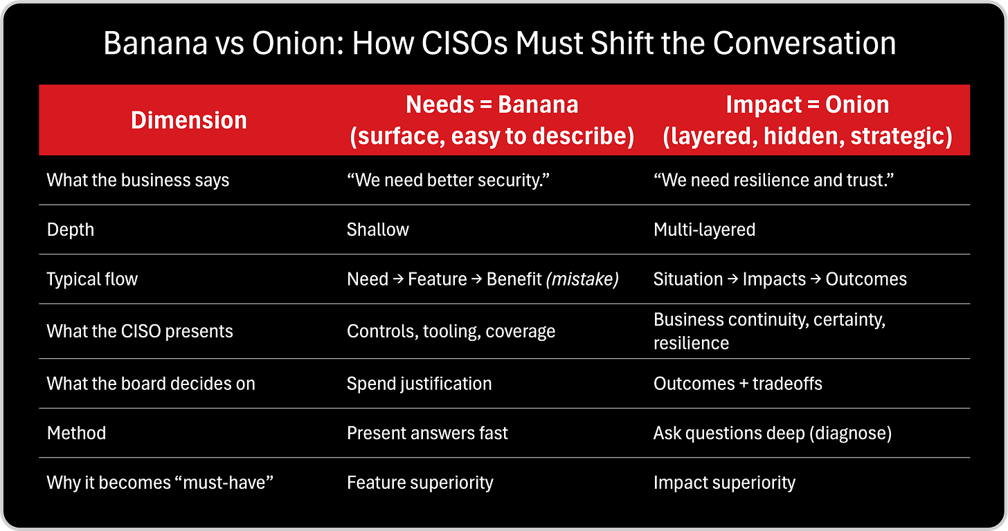 When I was reading Jacco’s framework, one metaphor immediately stuck with me because it describes the CISO communication gap better than any security dashboard ever could. Jacco explains that “needs” are like a banana: visible, simple, and easy to describe. But “impact” is like an onion: layered, deep, and often hidden beneath multiple layers that must be peeled back by asking better questions. And this is exactly what happens in cybersecurity. Executives often express a surface need, “we need ransomware protection,” “we need compliance,” “we need better visibility”, but what they are truly buying is not a tool or a control. They are buying continuity, trust, resilience, decision speed, and protection of strategic initiatives. That’s why I believe the modern CISO must stop presenting solutions too early and instead learn to peel the onion first, because impact is what transforms security from a cost conversation into a business conversation. The following two tables operationalize this model for CISOs: first, a simple side by side view of “banana vs onion“Peeling the Onion”: The CISO Question Ladder to Uncover Impact,” and second, a practical “question ladder” that helps translate surface security needs into executive-level impact.